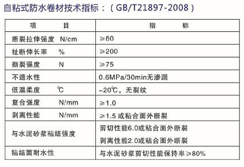 高分子自粘式防水卷材是近幾年發(fā)展的一種具備承載功能的新型防水材料,具有國(guó)際 水平的優(yōu)質(zhì)防水卷材。通過(guò)獨(dú)特的高分子聚合物膠料與水泥漿料的濕固化反應(yīng),使傳統(tǒng)的粘結(jié)變成了濕固化反應(yīng)粘結(jié):把傳統(tǒng)粘結(jié)在基層上防水材料變成了采用預(yù)鋪式背粘在結(jié)構(gòu)本體上,與現(xiàn)澆混凝土持久地緊密粘在一起,有效地防止地下水滲入,且不受混凝土地下結(jié)構(gòu)產(chǎn)品沉降影響。解決了長(zhǎng)期以來(lái)地下竄水難題。