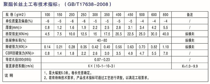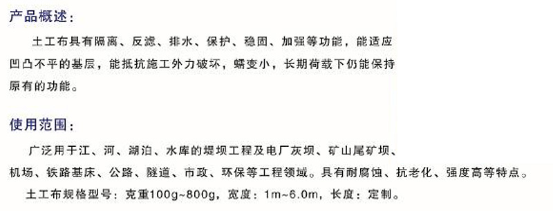該產(chǎn)品具有優(yōu)良的過(guò)濾作用、排水作用、隔離作用、加筋作用、防護(hù)作用??蓮V泛用于鐵路、公路、運(yùn)動(dòng)館、堤壩、水利建筑、隧道、沿海灘涂、圍懇、環(huán)保、電廠、機(jī)場(chǎng)等工程。